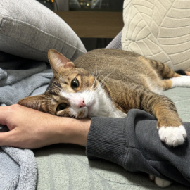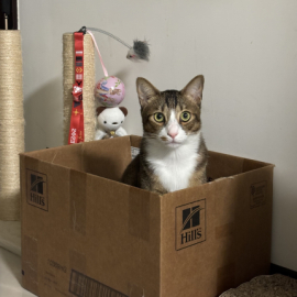 聰明的你學了好多才藝,好快就學會握手、擊掌、坐下、過來、看鏡頭,甚至知道進廚房媽媽會生氣,總是在媽媽要過去抓你時跑出來裝沒事。你最喜歡早上的時候在爸爸窗邊看小鳥,喜歡黏著爸爸媽媽到書房到廚房,每次只要爸爸媽媽出門久一點,你就會很大聲的喵喵叫表達抗議,但是身體還是很誠實的到門口接爸爸媽媽,還會抓著板板放鬆心情,好像擔心了一整天。愛說話的你總是喜歡跟爸爸媽媽聊天談心,也愛用頭蹭爸爸媽媽討摸摸,真的是貼心又可愛的小寶貝。